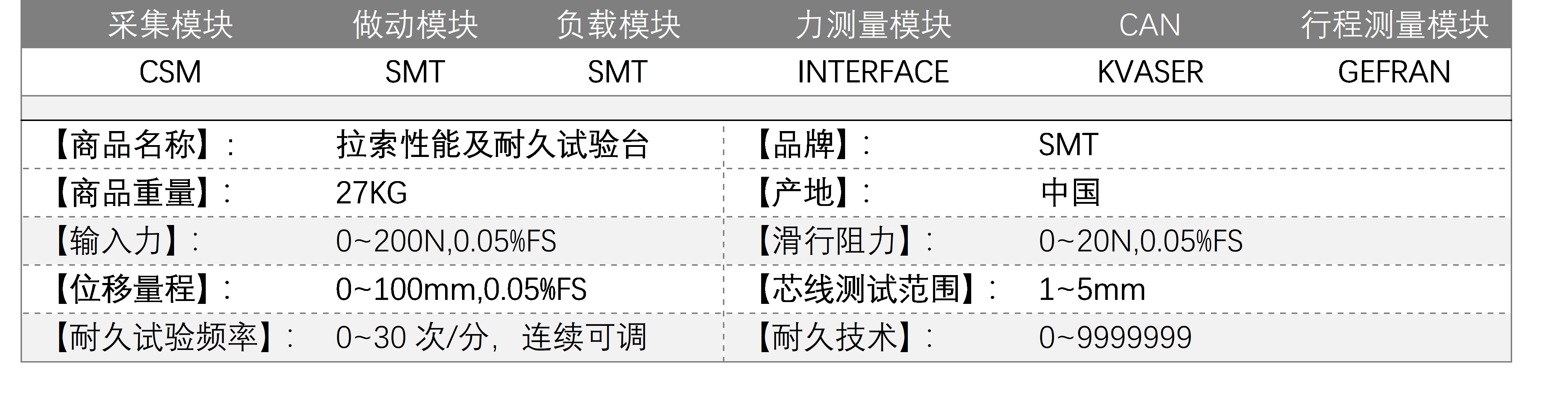 該試驗(yàn)臺按相關(guān)行業(yè)標(biāo)準(zhǔn)設(shè)計,實(shí)現(xiàn)操縱拉索的耐久試驗(yàn),可對駐車?yán)€、檔位拉線、油門拉線、全車蓋板拉線等進(jìn)行試驗(yàn),測試其行程效率以及負(fù)載效率等技術(shù)參數(shù)。系統(tǒng)可擴(kuò)展進(jìn)行耐久性試驗(yàn),試驗(yàn)過程能夠統(tǒng)計工作次數(shù),且當(dāng)拉索失效會自動聲或光報警并停止工作,能繪制相應(yīng)的性能曲線,并對相關(guān)的檢測結(jié)果進(jìn)行統(tǒng)計、分析、保存。