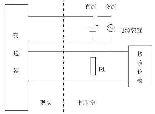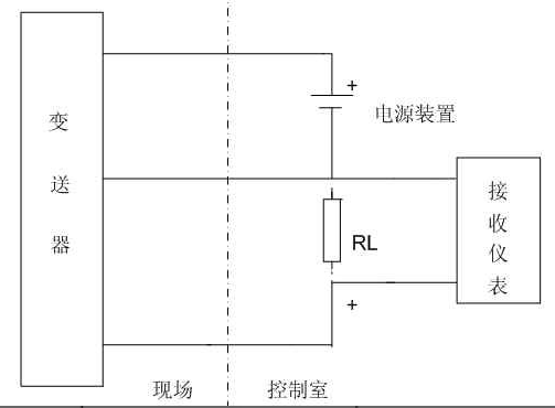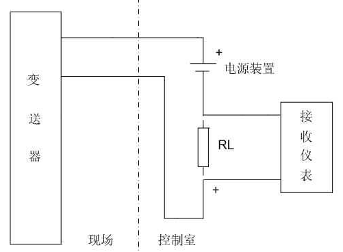 兩線接法即輸出只有兩根線,接線圖如下所示,只需將變送器(放大器)輸出和電源,檢測(cè)儀表串聯(lián)即可。